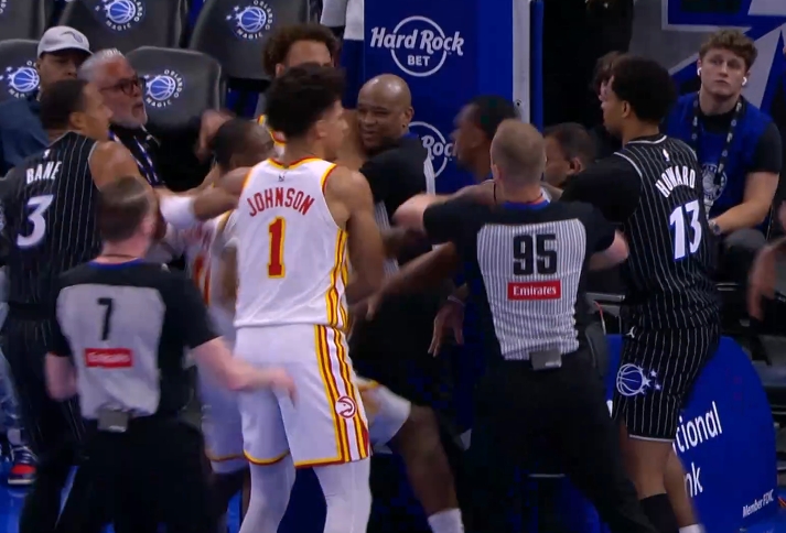 随后老鹰众将不满,双方爆发激烈冲突。裁判在冲突中紧紧抱着情绪激动的老鹰后卫丹尼尔斯,随后两人双双倒地。