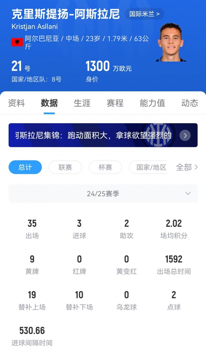 阿斯拉尼现年23岁,司职中场。国米在2023年以1570万签下阿斯拉尼,效力球队至今,阿斯拉尼出场99次,贡献4球5助,目前球员德转身价为1300万欧元。